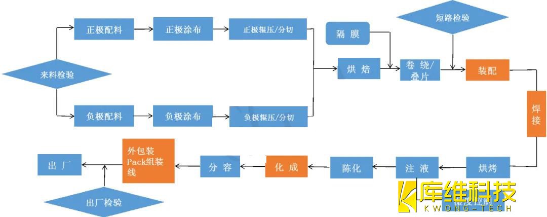 鋰電池制造工藝的基本流程可以分為前中后三段,即前段的配料、涂布、輥壓、分切;中段的卷繞、疊片、裝配、焊接、注液、封口;后段的化成、分容、PACK、倉儲物流.
